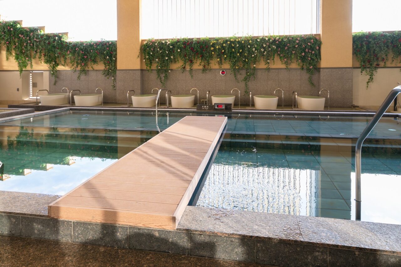 各エリアに多種の浴槽や温冷交代浴の仕掛けなど健康増進の機能を付加した。