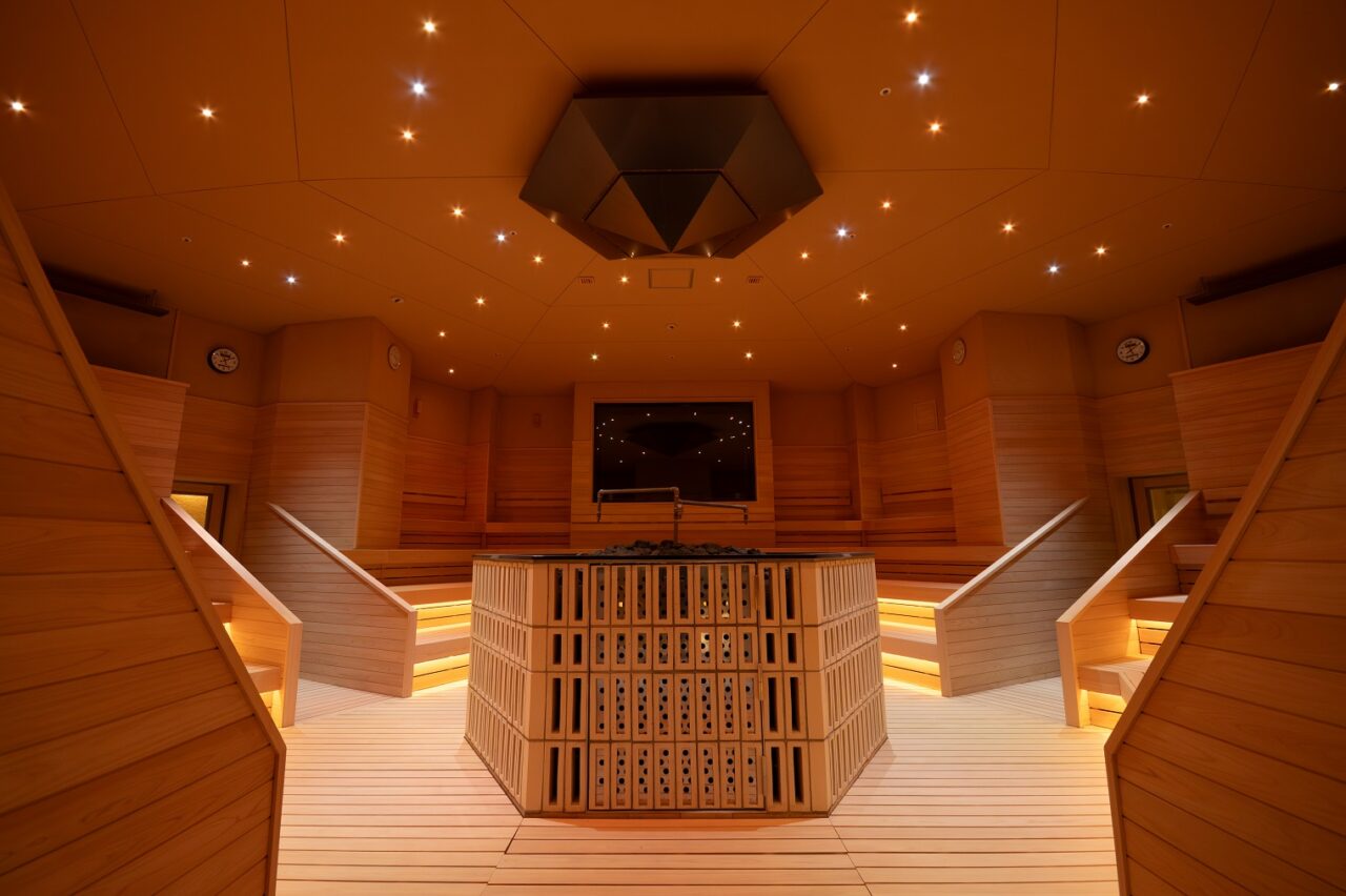 ドイツエリアのサウナシアターは日本最大級の収容人数。