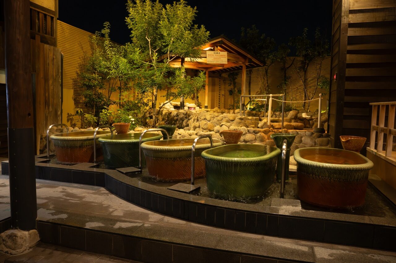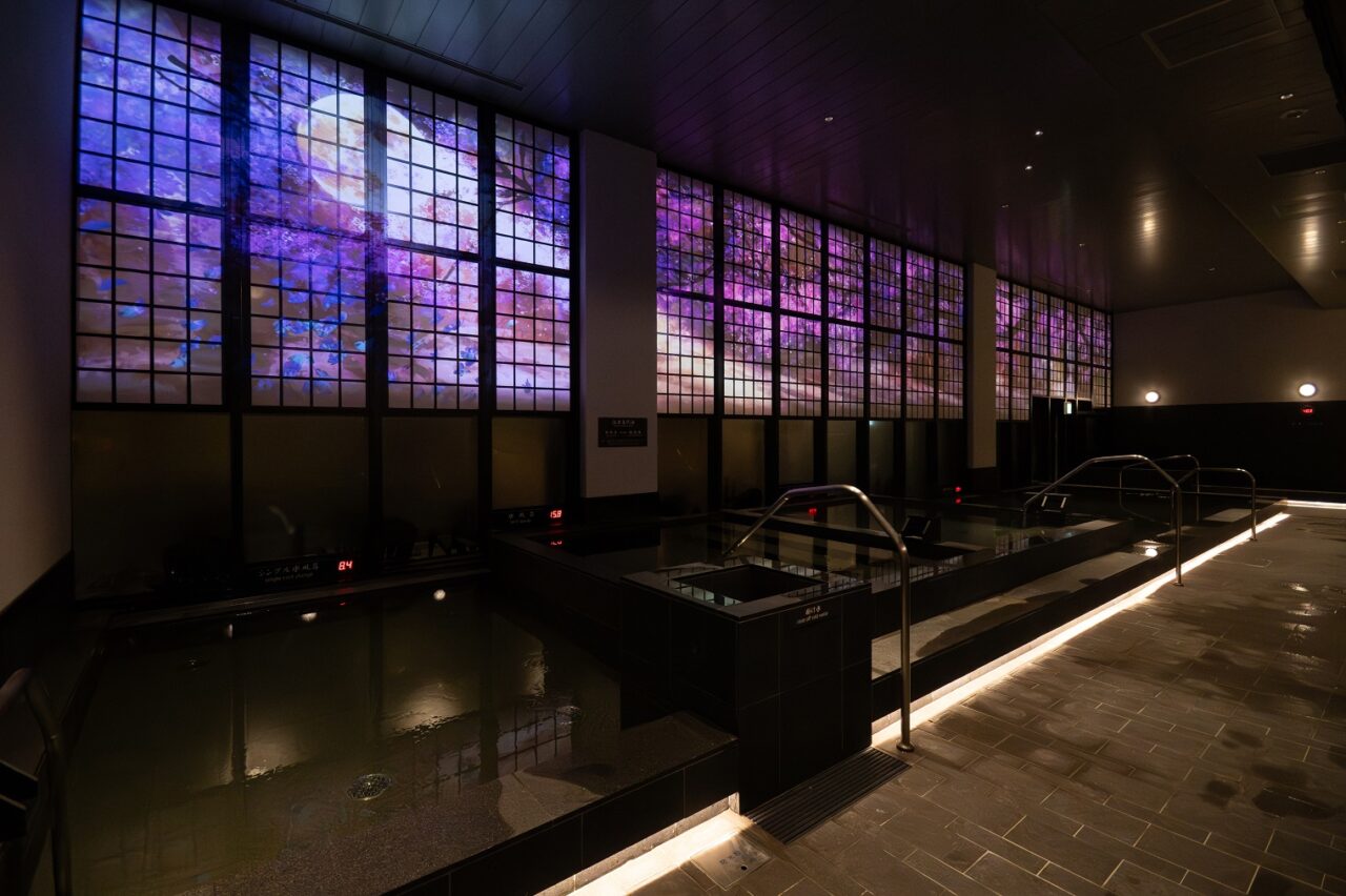 各エリアに多種の浴槽や温冷交代浴の仕掛けなど健康増進の機能を付加した。